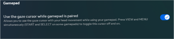 The gaze mode cursor will be automatically enabled when there are no other input options available (when hand tracking is disabled and the Meta VR controllers are not connected/dead battery/out of range). It can also be manually enabled using the connected gamepad by pressing the START and SELECT buttons at the same time.